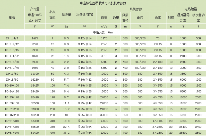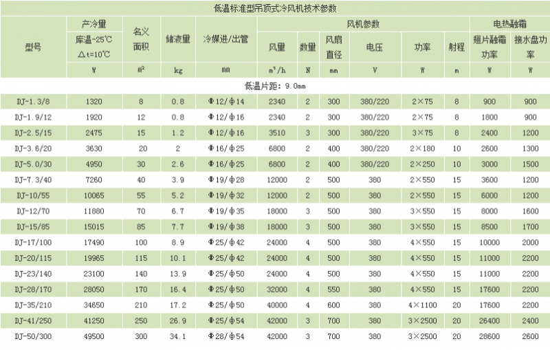 冷风机是一种配套于氟利昂制冷机组使用的库内冷却降温设备,按适用温度来分,分为DL、DD、DJ、三种系列,可分别适用于不同的库温,DL型冷风机主要适用于0℃左右的保鲜库;DD型冷风机主要适用于-18℃的冷藏库,DJ型冷风机主要适用于-25℃以下的速冻库 。